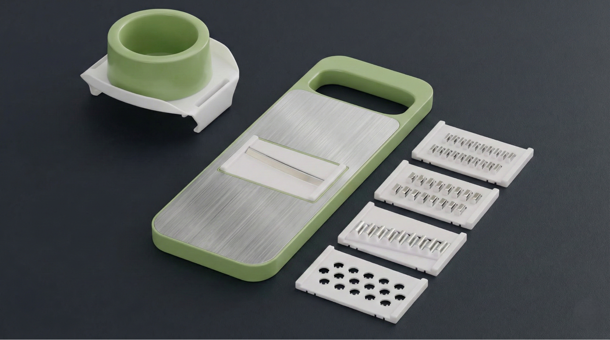 Upgrade your kitchen with the 5-in-1 Vegetable Cutter Set. It is not just a slicer; it is a complete prep station. With a stainless steel runway and 5 interchangeable blades, you can slice, julienne, or grate veggies in seconds.